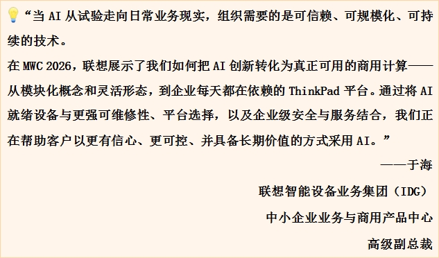 在MWC 2026上,联想B2B商用产品延续CES与Tech World的势能,集中展示新一代AI驱动的商用设备组合、智能形态创新,以及面向企业的可落地平台能力,帮助组织在更可控、更可靠的前提下规模化采用AI。