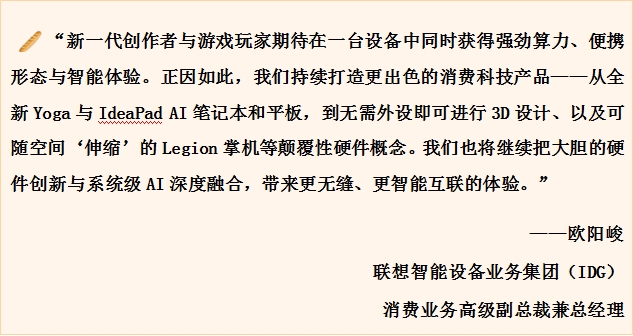 MWC 2026,联想围绕创作者、学习型用户与核心玩家三类人群,带来一组更清晰、更“场景化”的消费级产品组合:Yoga继续强化高端创作与多形态交互,Idea聚焦学习与日常生产力的连续工作流,Legion则把移动游戏体验推向更灵活的形态与更强的掌控感。三条产品线背后指向同一个方向:让设备不只更强,更能跟随用户在不同场景中切换状态。